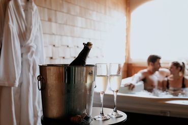 Arrive to a romantic spa suite with petals on the bed, a romantic soaking tub, steam shower and private lake view balcony with panoramic views. Roses and mood uplifting Rock and Grace non alcoholic champagne and chocolates on arrival are the perfect way to celebrate a special occasion or proposal.